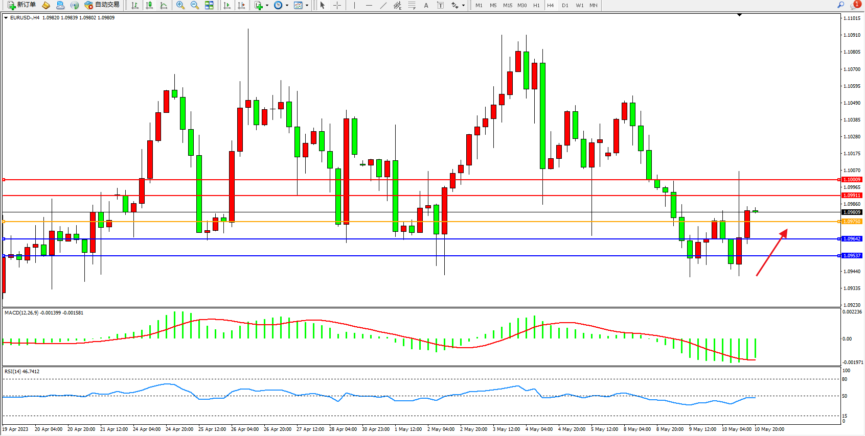备选策略:1.09750下方看跌,目标1.09642  1.09537