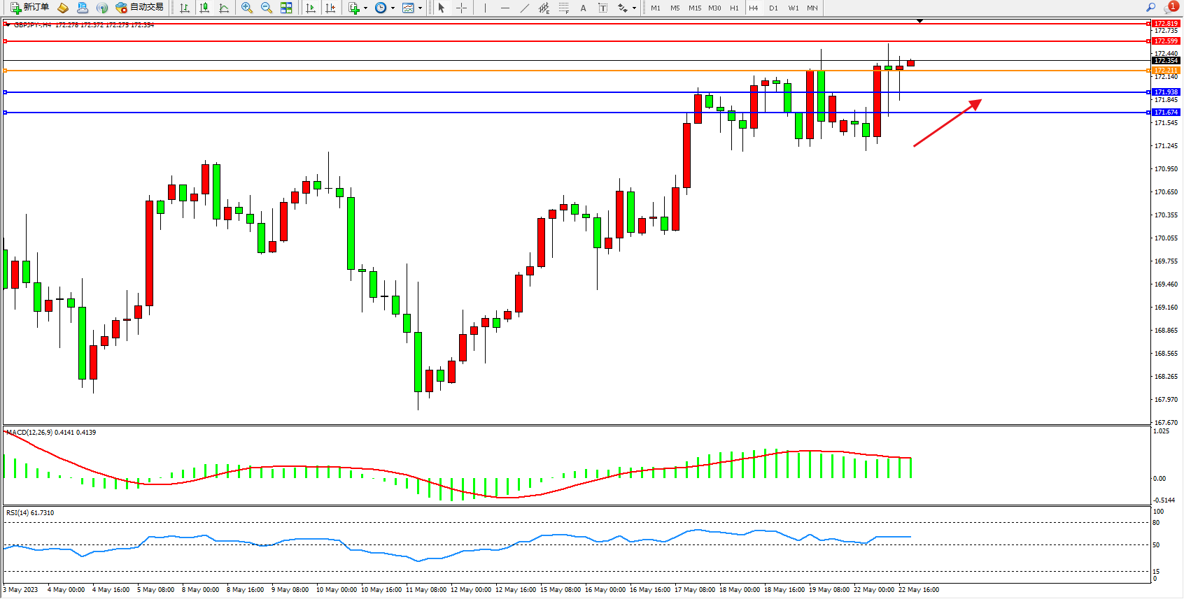 4小时图看:高位多头动力维持宽幅震荡后上扬,短期看涨情绪涌现,市场多头不断向上移动中,MACD指标处于多头区域维持整理,RSI指标处于多头区域维持徘徊;