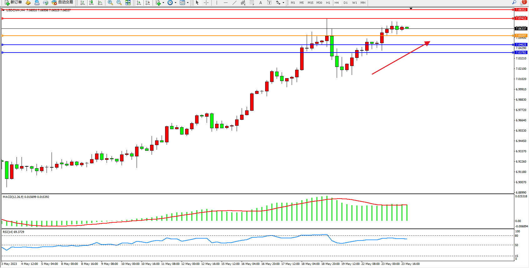 备选策略:7.05597下方看跌,目标7.04625 7.03782
