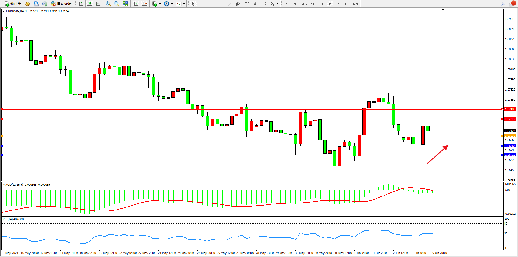 欧元兑美元维持1.07124附近震荡,目前市场已经消化了3.70%的峰值利率。欧洲央行政策制定者似乎明确暗示会在6月和7月加息,但此后的任何举措都将高度取决于未来几个月的数据发展。