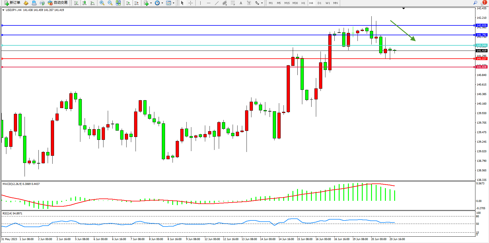 4小时图看:高位空头震荡下移,短期跌势或将延续,市场空头情绪笼罩,短期有继续向下移动态势,MACD指标处于多头区域震荡下行,RSI指标处于50均衡线上側弱势徘徊;
