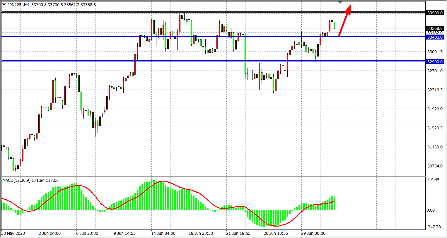 4小时图看,日经指数反弹到前高点33900一线小幅受阻,MACD量能维持零轴之上,行情仍是涨势,阻力关注33900,支撑关注33400、32900。