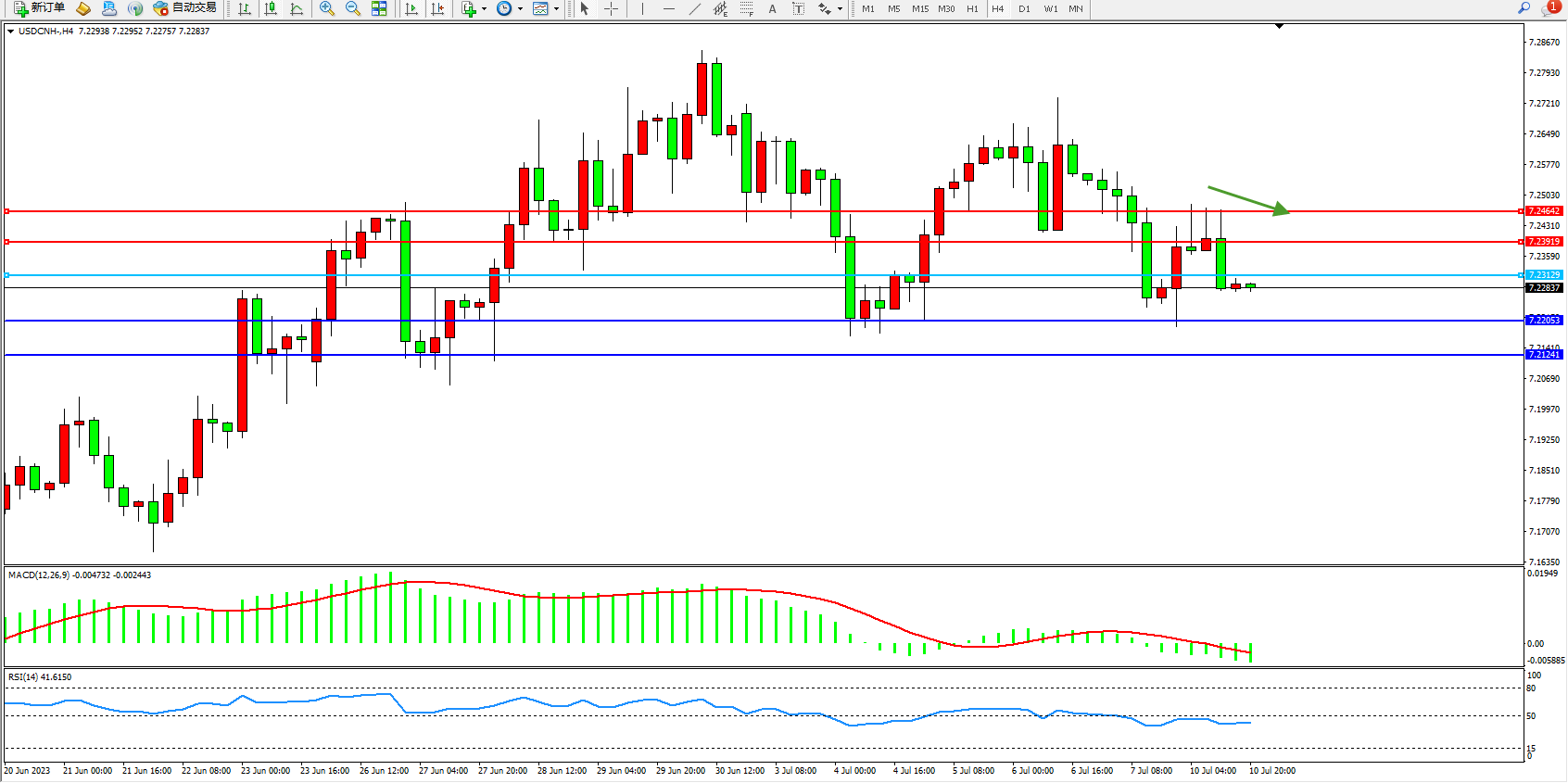 美元人民币USDCNH——4小时K线图显示: