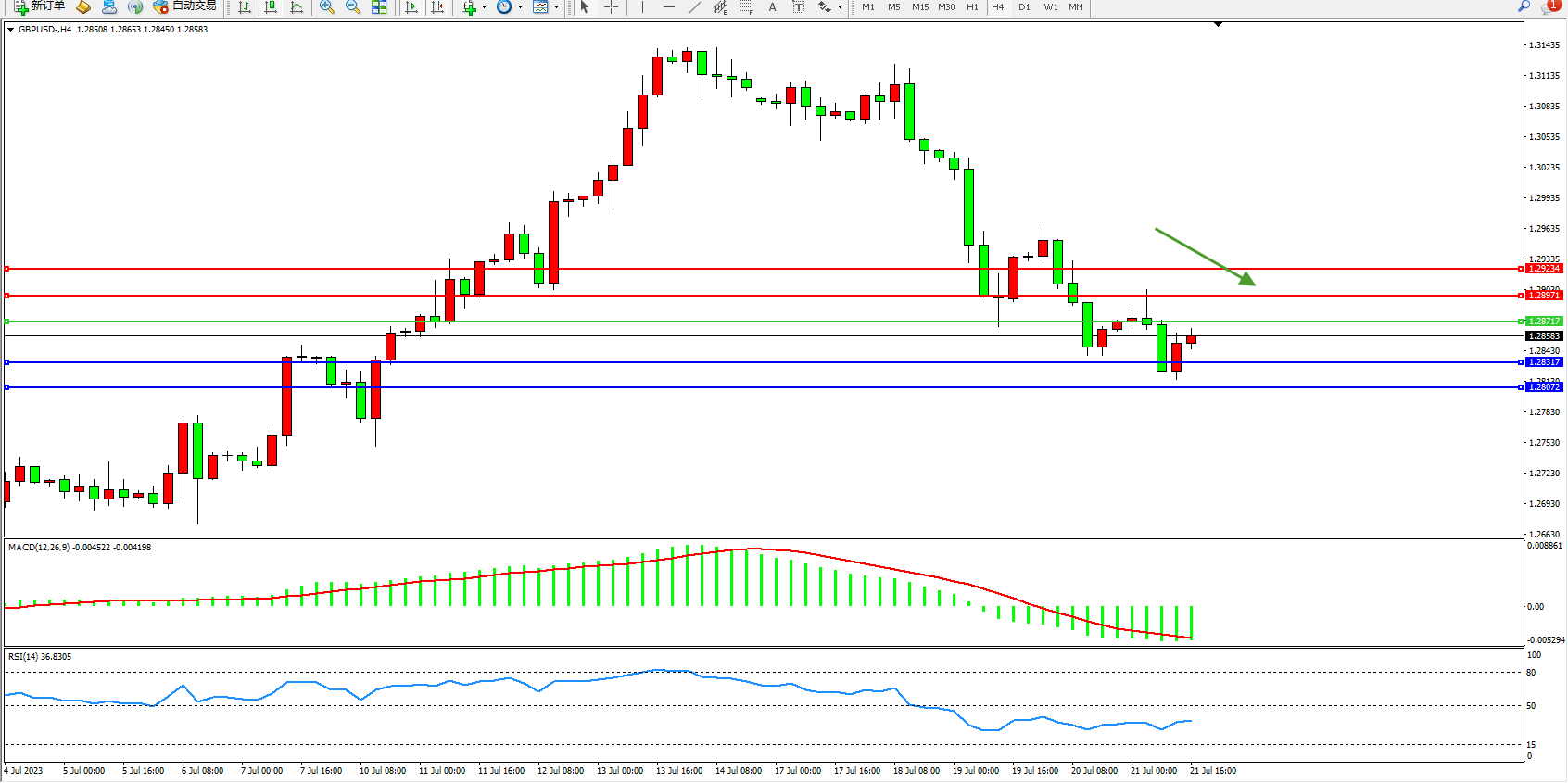 交易策略:1.28717下方看跌,目标1.28317  1.28072