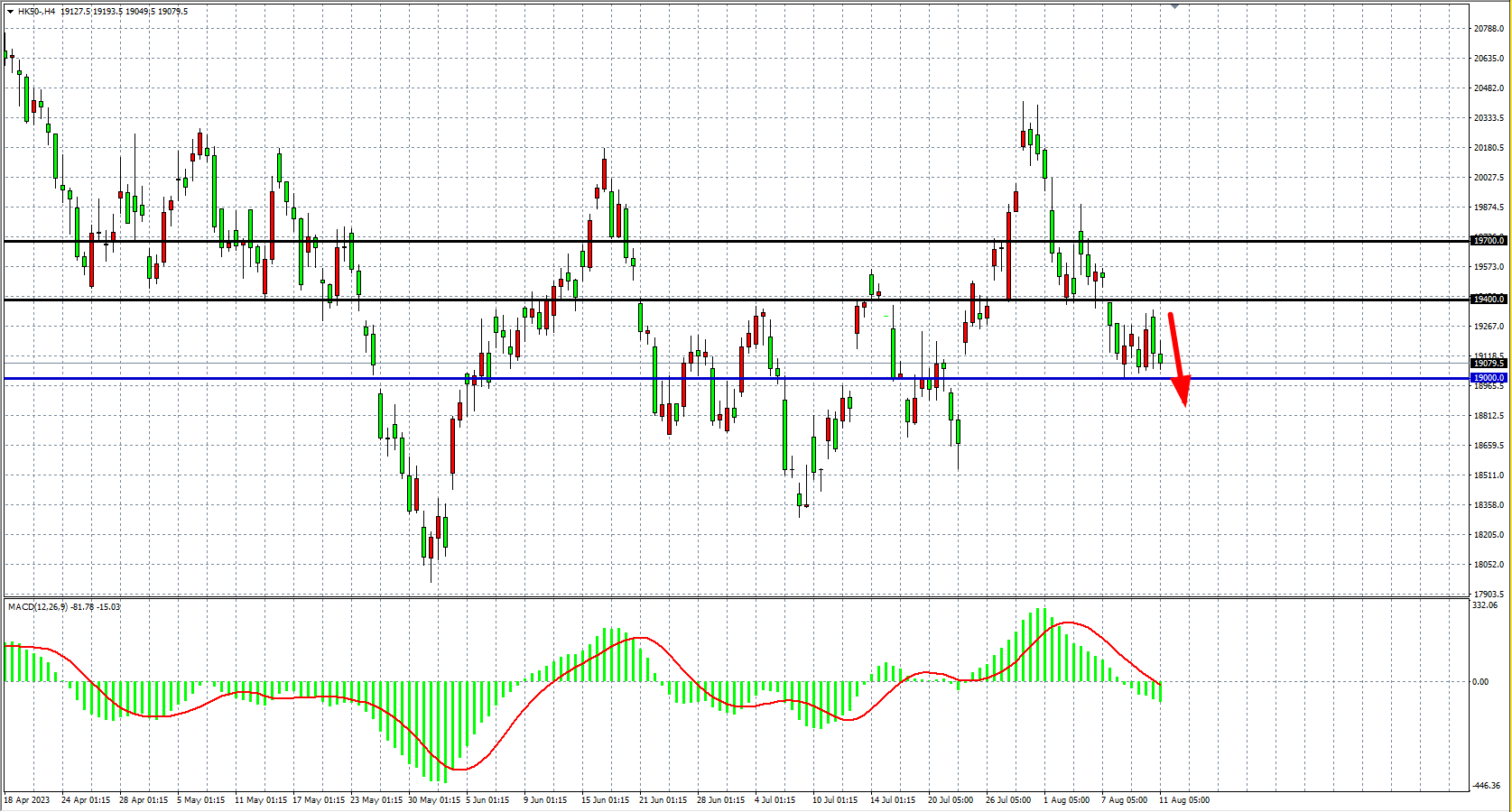 4小时图看,恒指在19000之上盘整,MACD量能于零轴下,阻力关注19400,支撑关注19000附近。