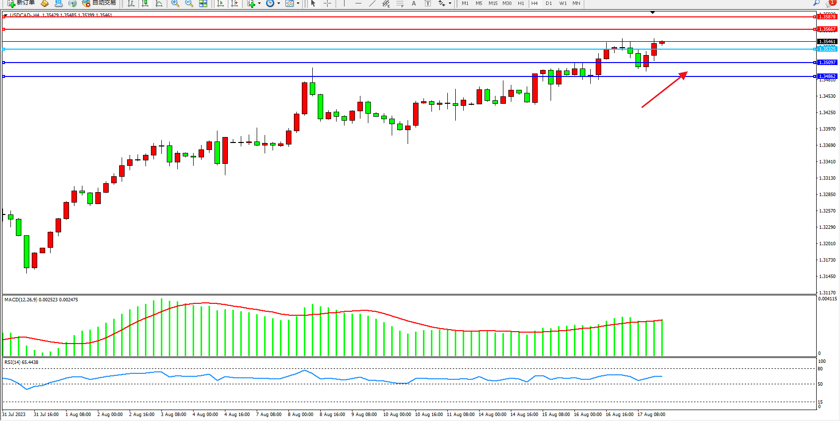 美元加元USDCAD——4小时K线图显示: