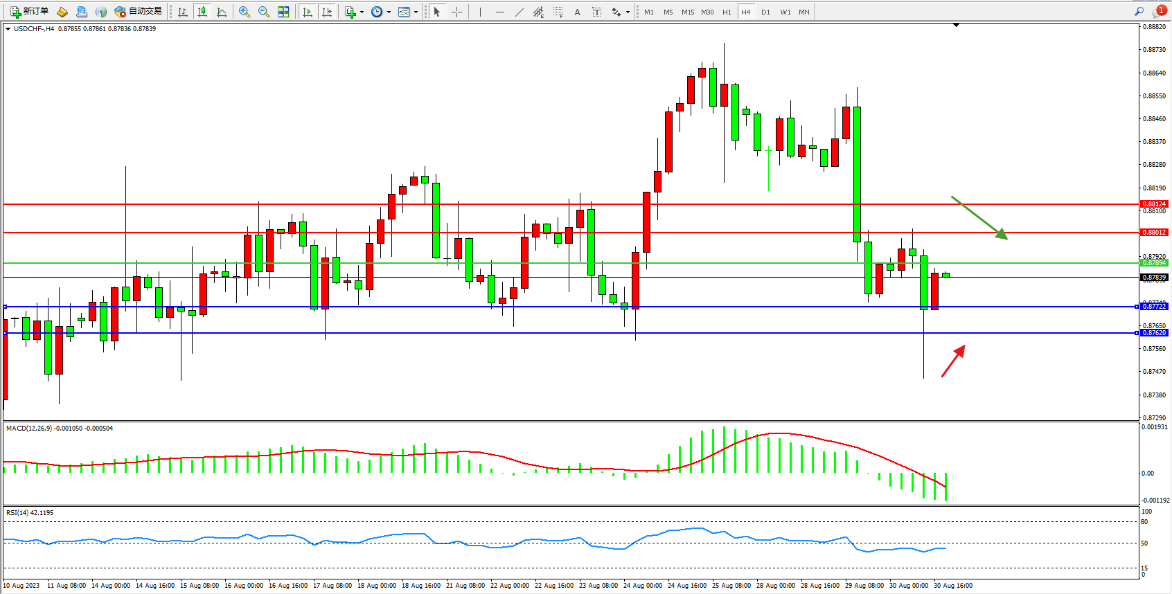 美元兑瑞郎维持0.87839附近震荡,8月份瑞士ZEW投资者信心指数下跌6点,至-38.6点。瑞士信贷表示:瑞士金融分析师情绪依然悲观。”预计瑞士央行将再次上调基准利率,因预计今年秋季通胀将上升。