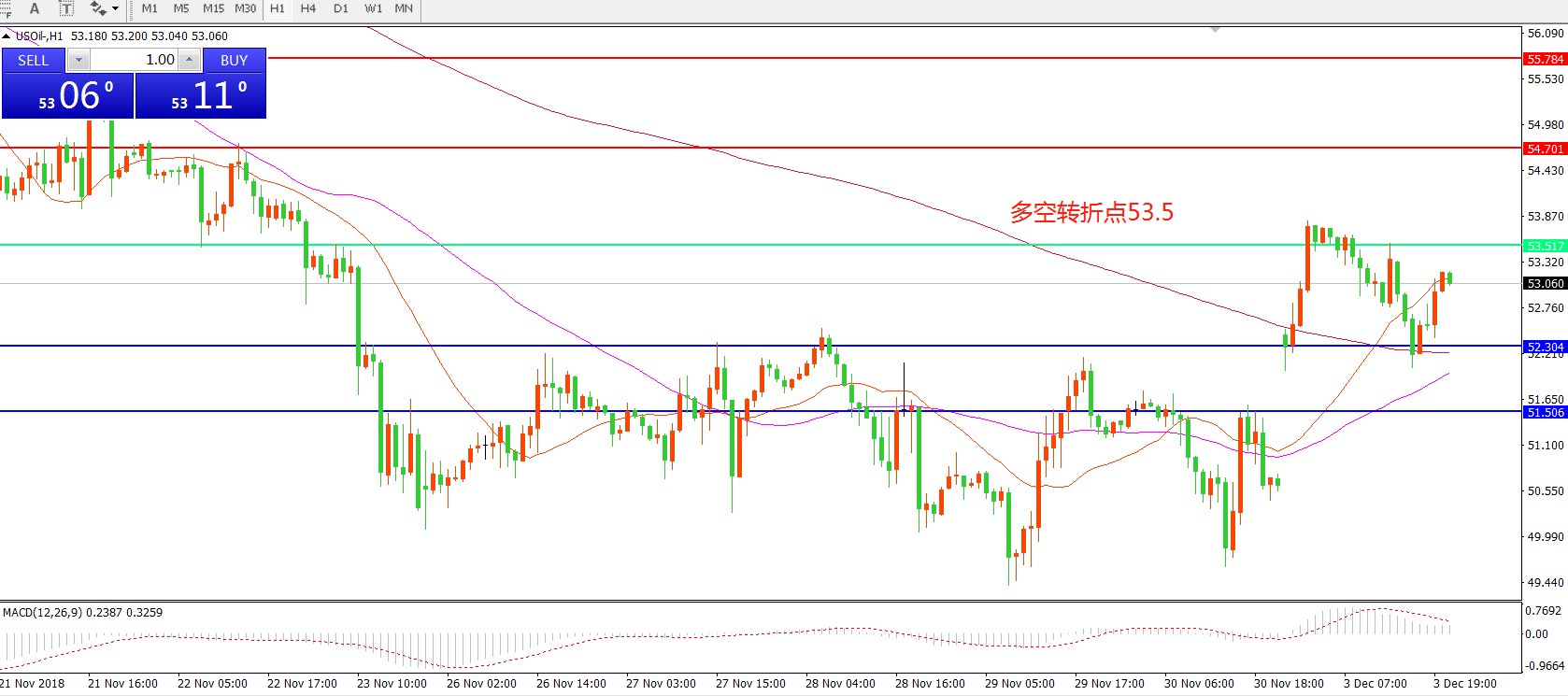 小时图看,油价受G20利好消息影响,跳空高开并,站稳前期阻力52.3后陷入震荡,短期均线拐头向上,MACD绿柱缩短,红柱增加,短期仍以反弹做多思路对待。