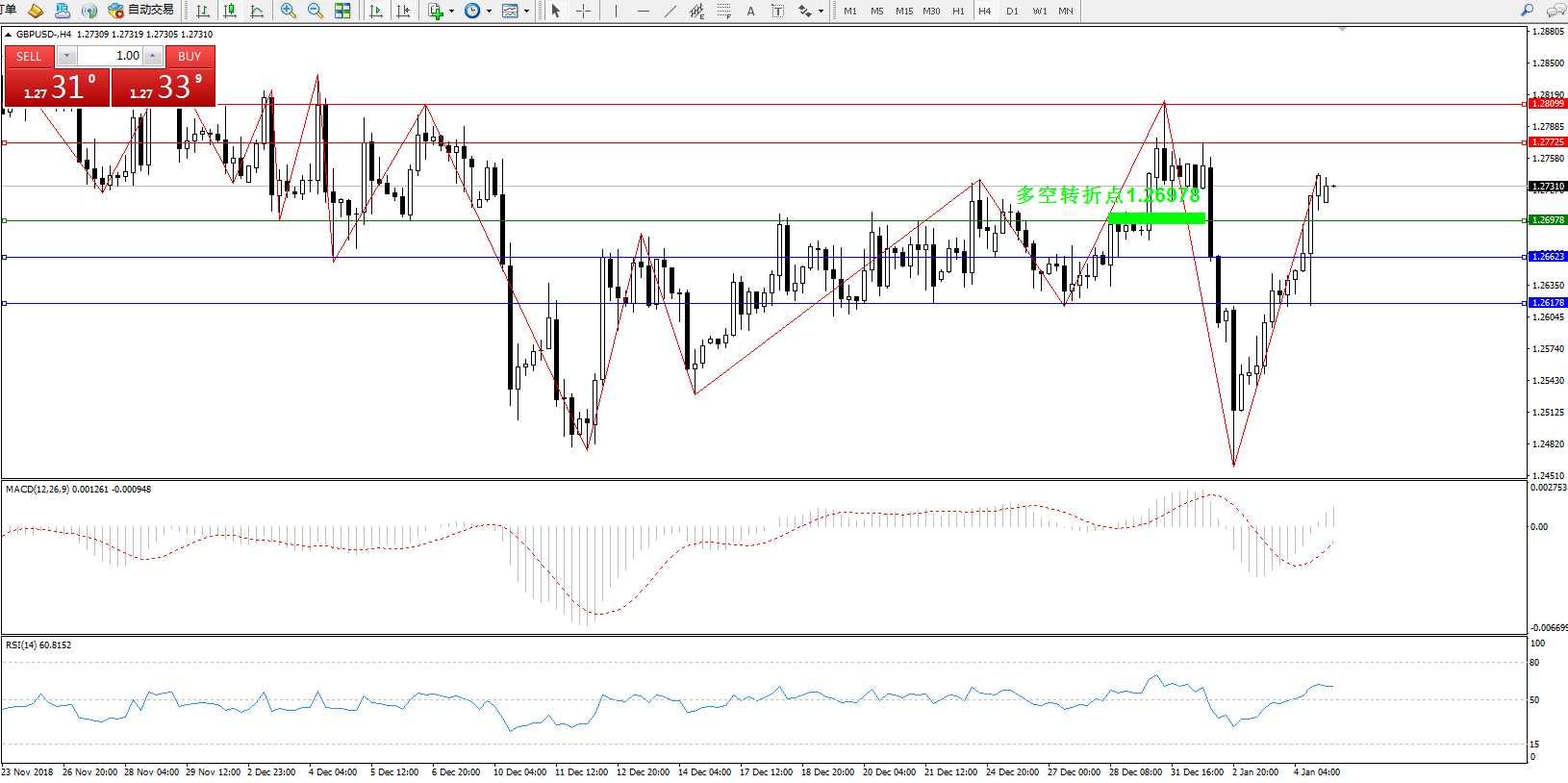 交易策略:1.26978上方看涨,目标1.27725、1.28099