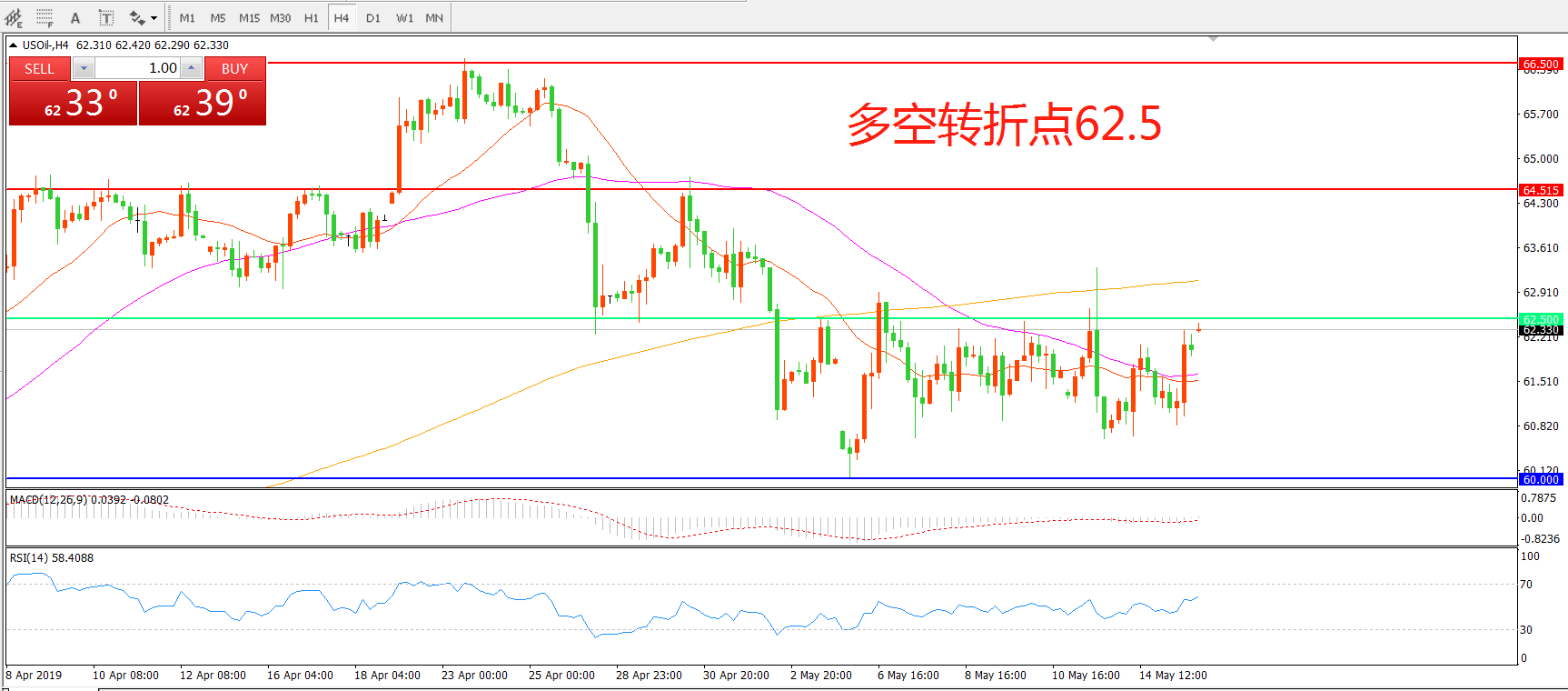 4小时图看,油价连续整理后长阳上升,整体走势有所企稳,短期均线形成的阻力被突破,日内延续震荡的概率较大,重点关注62.50一线得失