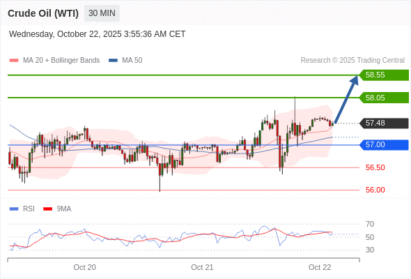 在 57.00 之上,看涨,目标价位为 58.05 ,然后为 58.55 。