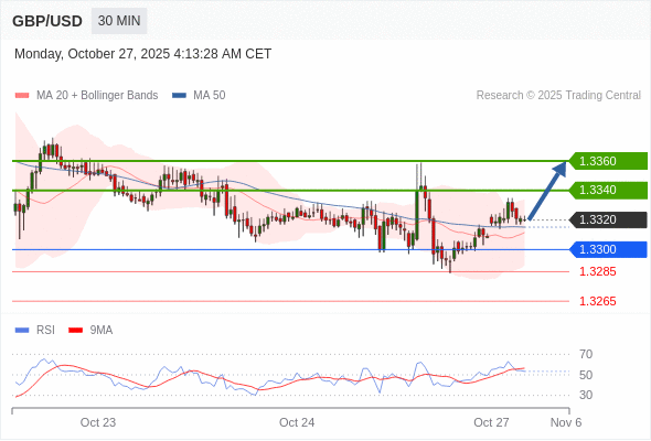 在 1.3300 之上,看涨,目标价位为 1.3340 ,然后为 1.3360 。