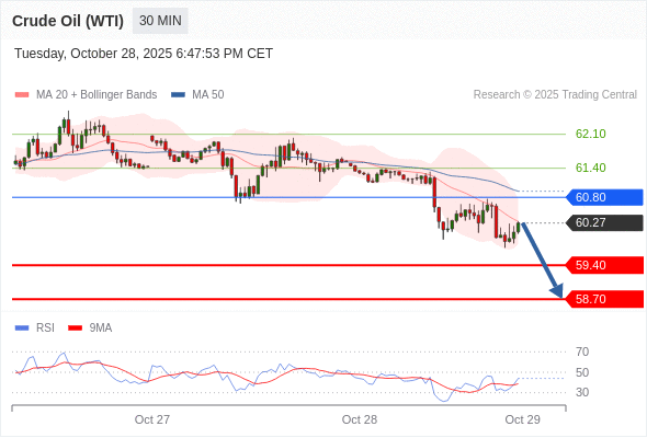 在 60.80 之下,看跌,目标价位为 59.40 ,然后为 58.70 。