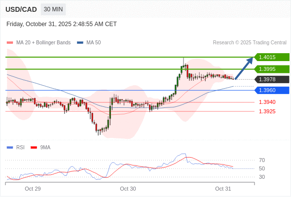 在 1.3960 之上,看涨,目标价位为 1.3995 ,然后为 1.4015 。