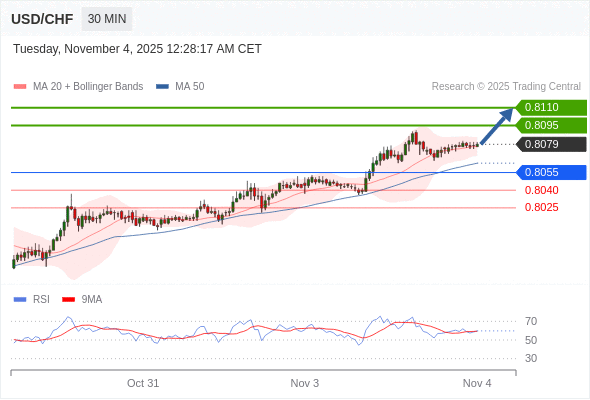 在 0.8055 之上,看涨,目标价位为 0.8095 ,然后为 0.8110 。