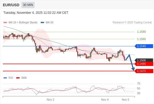 在 1.1540 之下,看跌,目标价位为 1.1490 ,然后为 1.1470 。