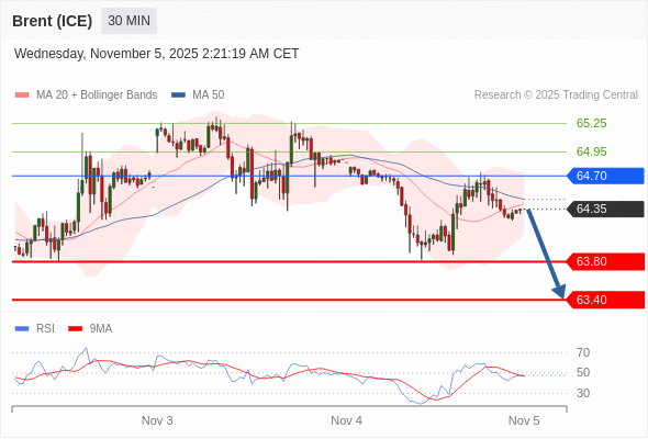 在 64.70 之下,看跌,目标价位为 63.80 ,然后为 63.40 。