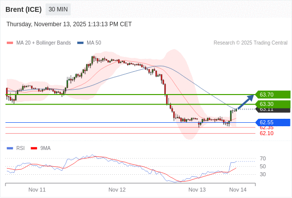 在 62.55 之上,看涨,目标价位为 63.30 ,然后为 63.70 。