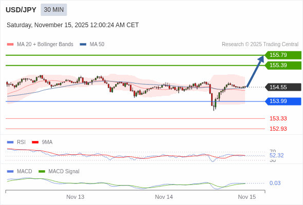 美元/日元 当日内 : 看涨,当 153.99 为支撑位。