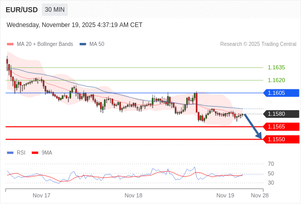 在 1.1605 之下,看跌,目标价位为 1.1565 ,然后为 1.1550 。