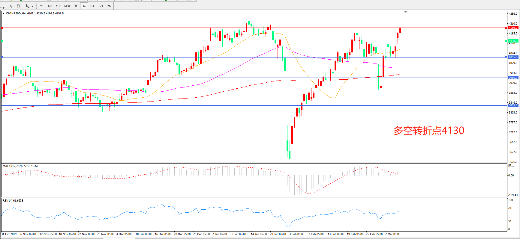周四(3月5日),三大指数全线高开,盘中指数震荡拉升,沪深300高开高走,收报4191.80点。两市成交额11720亿,较上一个交易日再度放量。现在市场做多的热情此起彼伏,再加上市场的做多品种围绕着热点展开,因此周五延续上行走势概率较大。