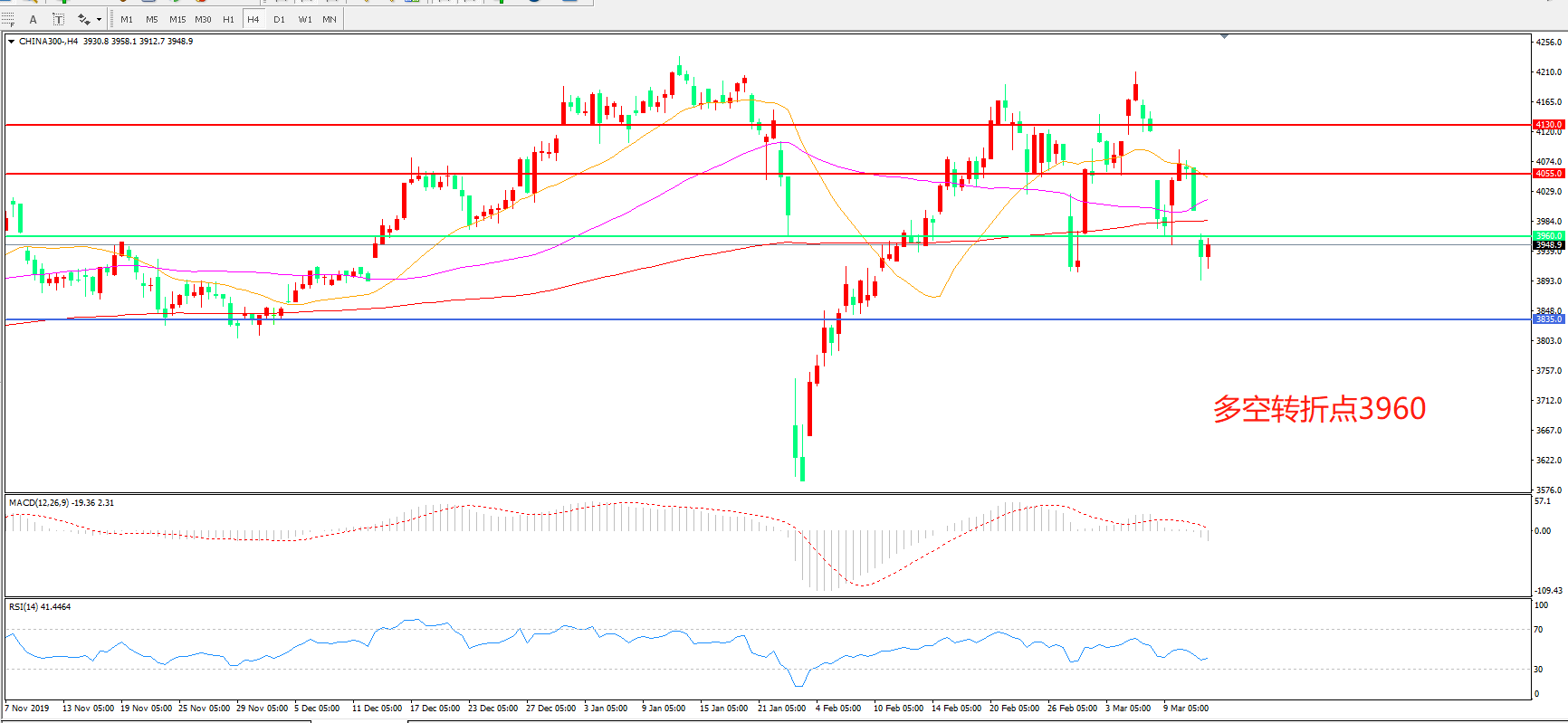 4小时图看,沪深300低开低走,整体表现略显低迷,3960成为短期多空分水岭,均线系统走平,MACD绿柱增加,RSI指标走平,日内延续下行概率较大。