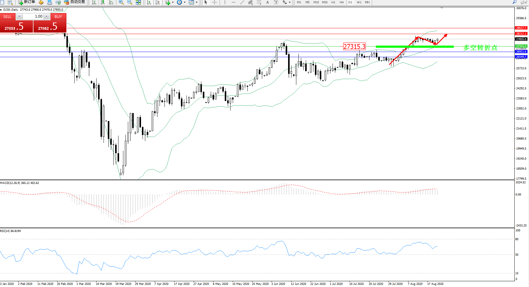 技术点评:多头动力延续布林带指标上轨附近持续震荡上扬走势良好,前期高位破位后维持高位整理平移中,但空头动力有伺机入场迹象,开始走平后向下移动,即将抵达中轨附近后有回升上移迹象,布林带指标呈张口走势后开始收口中,MACD指标长时间处于0轴线上方维持窄幅弱势整理平移中,RSI指标处于多头区域持续整理向上移动震荡;