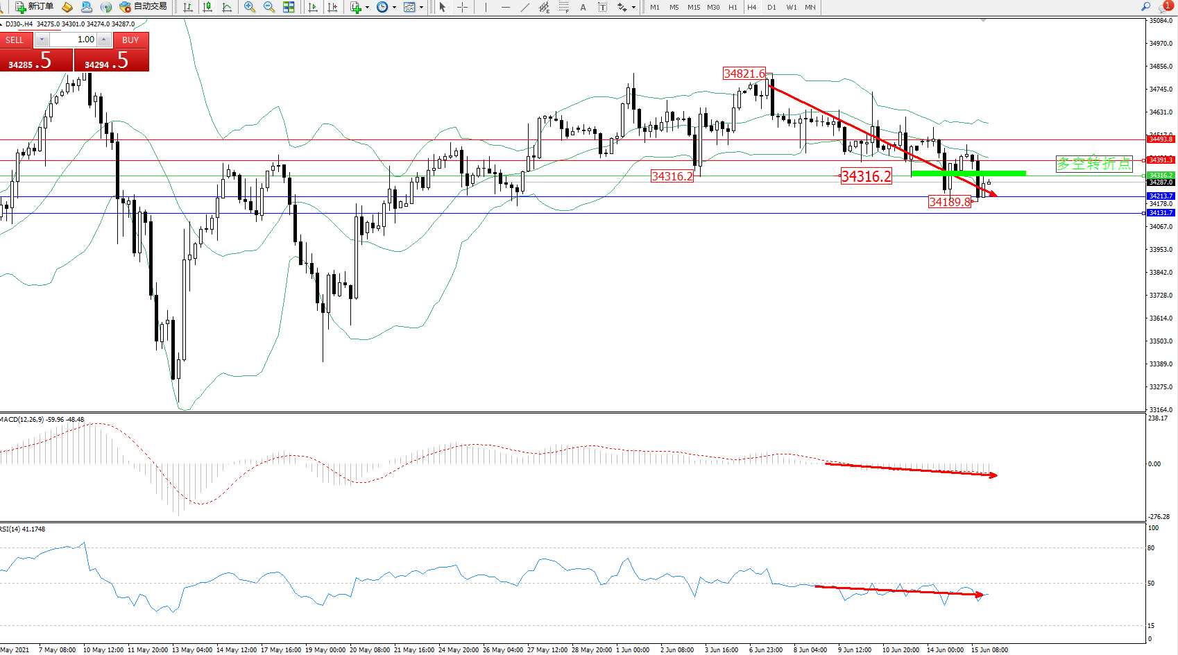 技术点评:空头动力延续布林带指标通道持续弱势震荡向下移动中,低位抵达34189位置后持续窄幅整理,虽跌破下轨附近节点后有短暂多头动力伺机入场,但未能改变下行趋势,布林带指标呈缓慢张口走势持续中,MACD指标处于0轴线下方空头区域维持整理徘徊下移,RSI指标处于50均衡线下方空头区域维持窄幅震荡中;