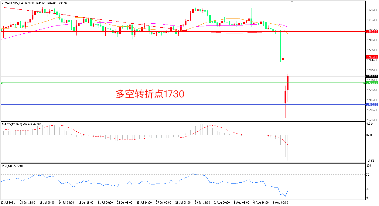 上周五(8月6日),非农数据意外靓丽令金价快速跌破1770美元关口,强劲的非农就业报告提振了人们的预期,对金价形成了巨大压力。 周一(8月9日),金价跳空低开,一度跌至1680美元/盎司,多空双方展开剧烈争夺,短期可能出现回补缺口的情况,但如果美元指数延续强势表现,中期金价可能再度出现大跌。