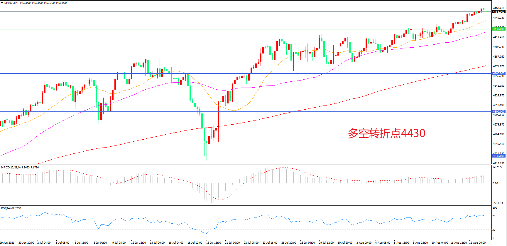 4小时图看,标普500以均线系统为支撑震荡上行,短期表现偏强,21周期均线成为下方支撑,4430成为多空分水岭,MACD红柱增加,RSI指标走平,日内震荡上行概率较大。