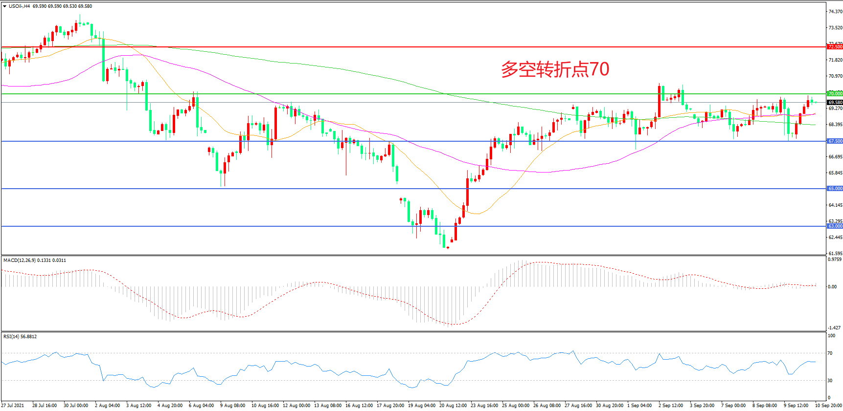 4小时图看,油价区间震荡迹象明显,67.5美元形成下方支撑,70美元成为上方阻力,MACD红柱缩短,RSI指标走平,日内延续宽幅震荡概率较大。
