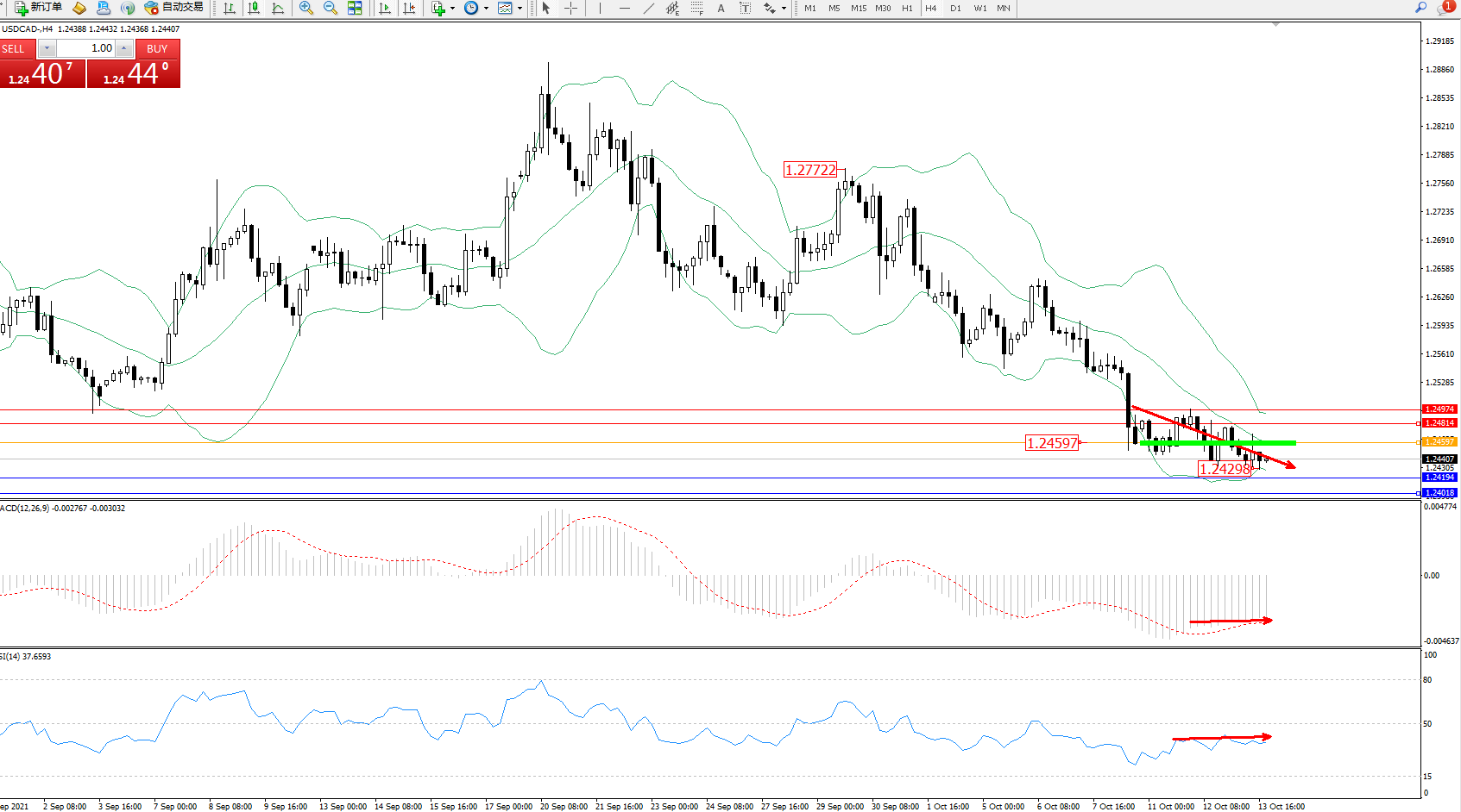技术点评:空头动力延续布林带指标通道中下轨区间持续震荡下行,低位抵达1.24298附近维持窄幅整理平移中,短期空头动力有进一步向下移动态势,布林带指标呈下行趋势通道走势持续,低位有短期收口走势,MACD指标处于空头区域维持整理平移,RSI指标处于空头区域维持弱势窄幅徘徊中;