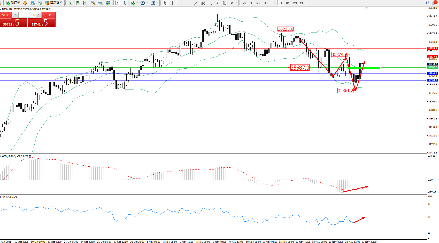 交易策略:35687上方看涨,目标35837、35954