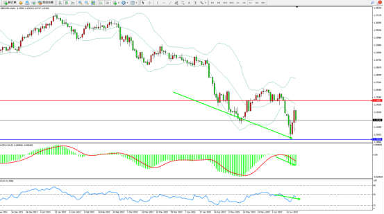 市场空头动力延续布林带指标通道内呈阶梯式震荡下挫,多次触及下行趋势线后回升,但整体下行走势或将延续,布林带指标呈张口走势后开始有缓慢收口迹象,上方压制关注1.24901附近,低位支撑关注1.19324附近,MACD指标处于空头区域维持震荡下移后整理,RSI指标处于50均衡线下侧空头区域震荡,如图: