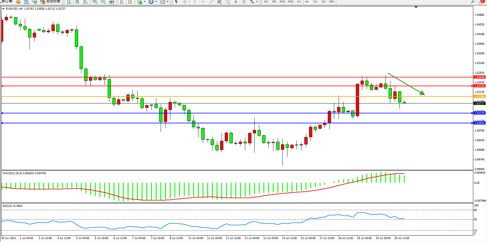 4小时图看:低位多头动力维持震荡上扬,高位短期遇阻回撤,空头动力伺机入场向下移动,MACD指标处于多头区域维持整理平移,RSI指标处于多头区域回撤至50均衡线附近徘徊;