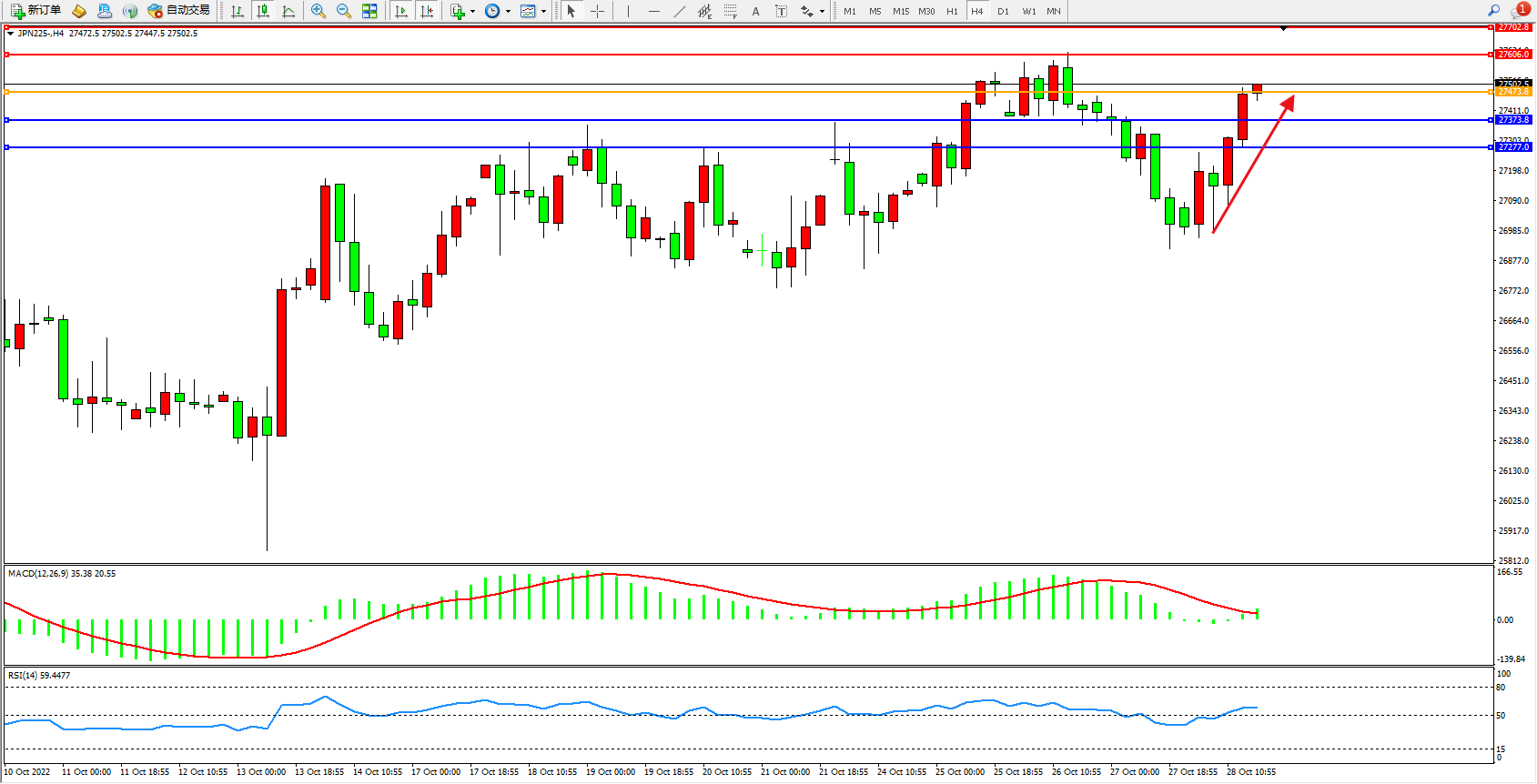 日经225指数10月28日(周五)收盘下跌240.74点,跌幅0.88%,报27104.50点。日本央行周五维持超低利率,并维持其鸽派政策指引,在全球央行紧缩浪潮中仍然特立独行,因经济衰退担忧削弱了对于经济稳固复苏的期许。