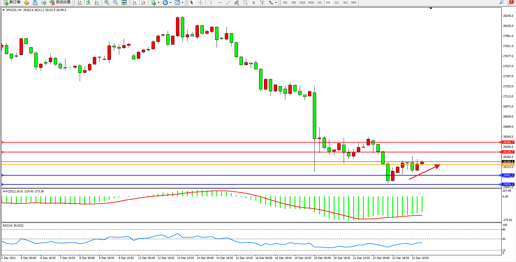 4小时图看:低位窄幅震荡,市场空头下行动力减弱,多头伺机入场,MACD指标处于空头区域缓慢上移,RSI指标处于空头区域震荡上行;