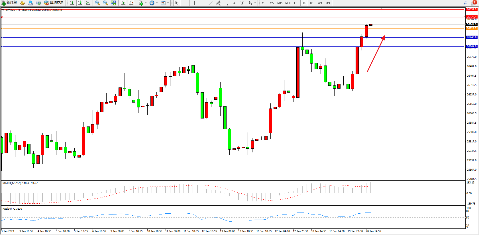 日经225指数1月20日(周五)收盘上涨132.27点,涨幅0.50%,报26537.50点。日本核心CPI升至4%的41年新高,这加大了日本央行所面临的市场压力,即要求其放弃收益率曲线控制政策。尽管与欧美相比,日本的物价上涨仍较为温和,但由于日元走软,以及进口大宗商品成本不断上升,其通胀上升速度已有所加快。