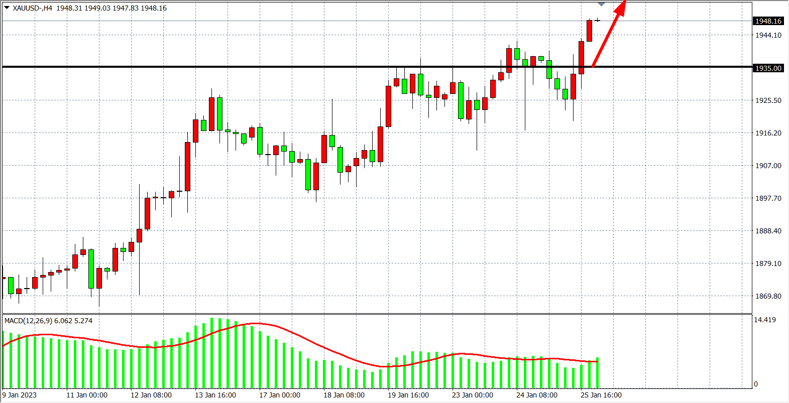 4小时图看,金价在1920之上持续走强,MACD量能在零轴之上量能均匀释放,显示行情仍有进一步走高的空间,当前支撑上移1935附近,在1935之上继续看涨,目标1950-1970附近。