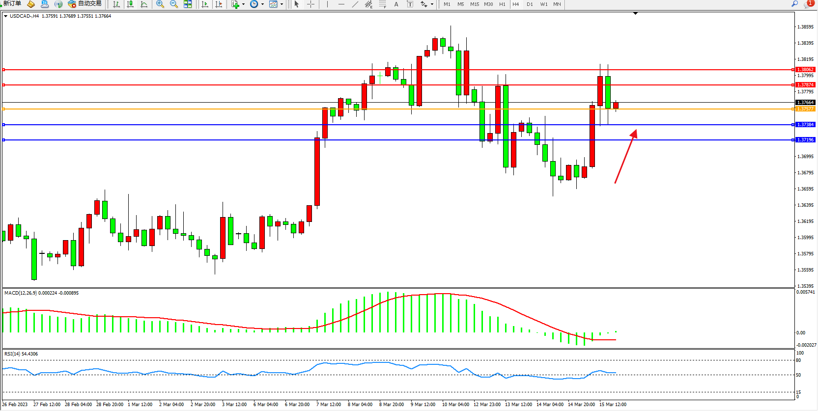 美元加元USDCAD——4小时K线图显示: