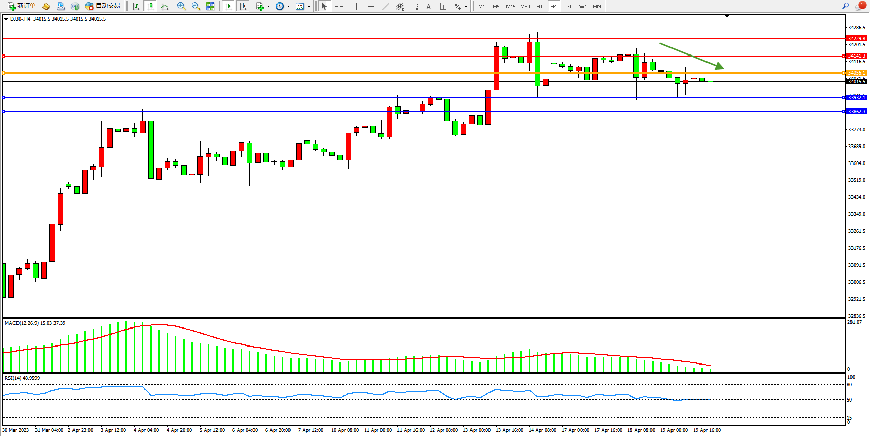 道琼斯指数4月19日(周三)收盘下跌79.29点,跌幅0.23%,报33897.34点;圣路易斯联储主席布拉德表示,鉴于近期数据显示通胀仍然持续,而整体经济似乎有望继续增长,即使增长缓慢,美联储应继续加息。