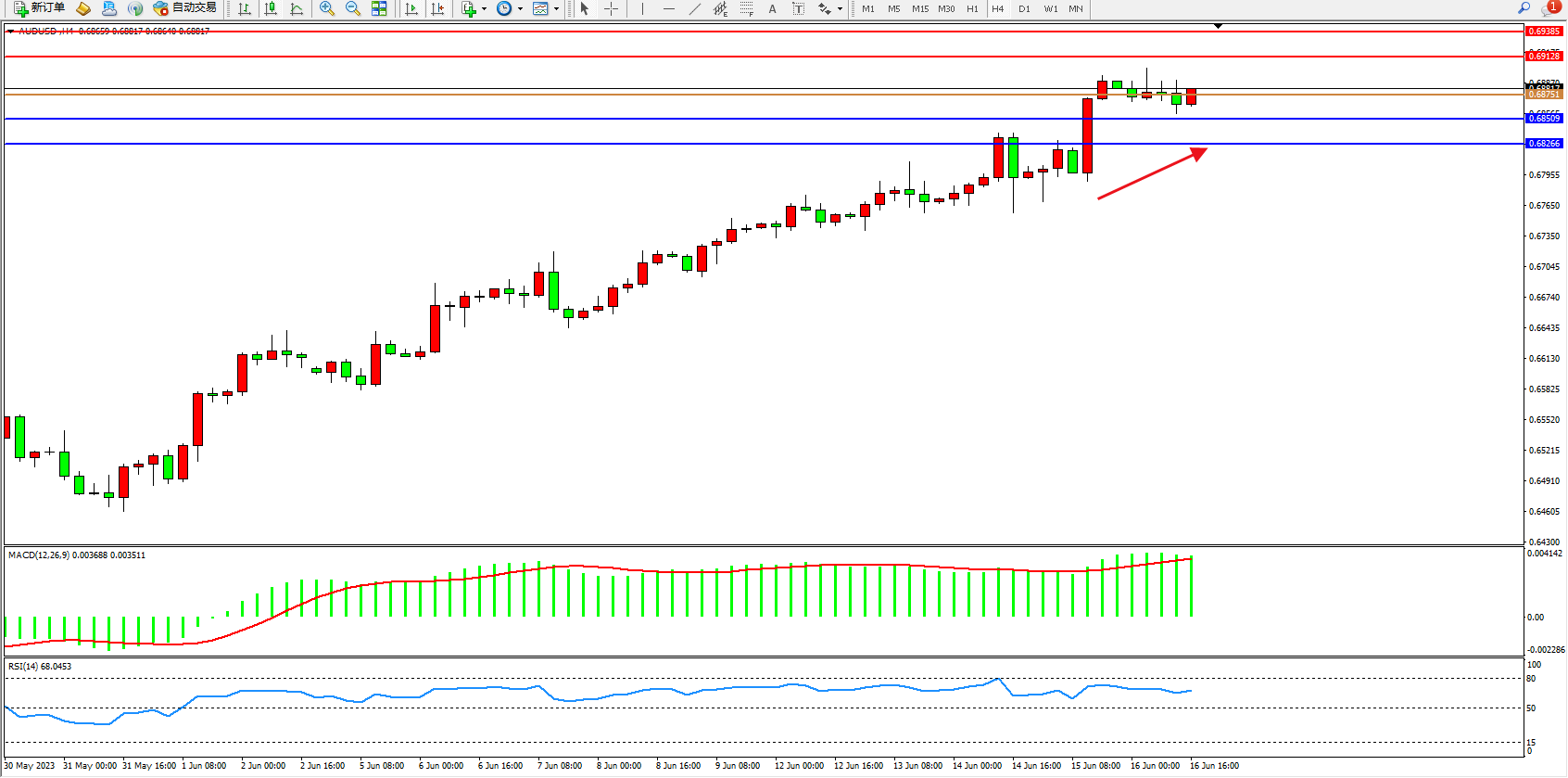 澳元兑美元维持0.68814附近震荡,市场已经消化了澳洲央行在7月再加息25基点的可能,押注今年晚些时候利率必然达到4.6%。比照美联储暂停加息的举动,澳联储未来仍存加息预期给到澳元提升的理由。