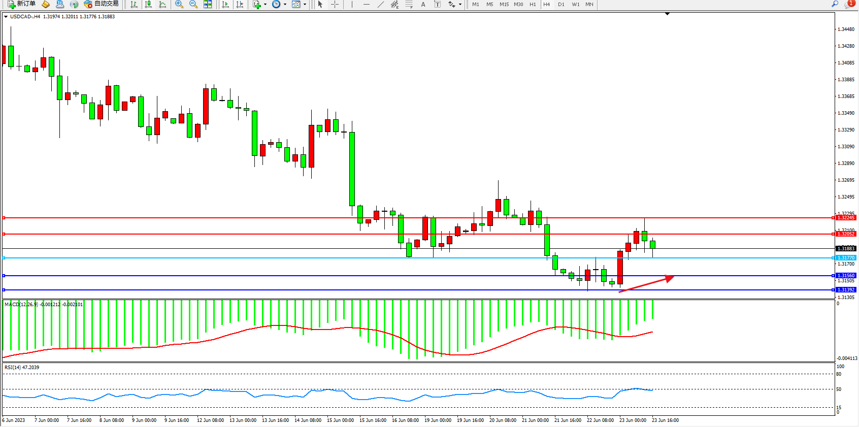 4小时图看:低位多头动力反转上移,市场看涨情绪持续,短期有继续反转向上移动态势,MACD指标处于空头区域震荡上移,RSI指标处于50均衡线附近弱势徘徊;
