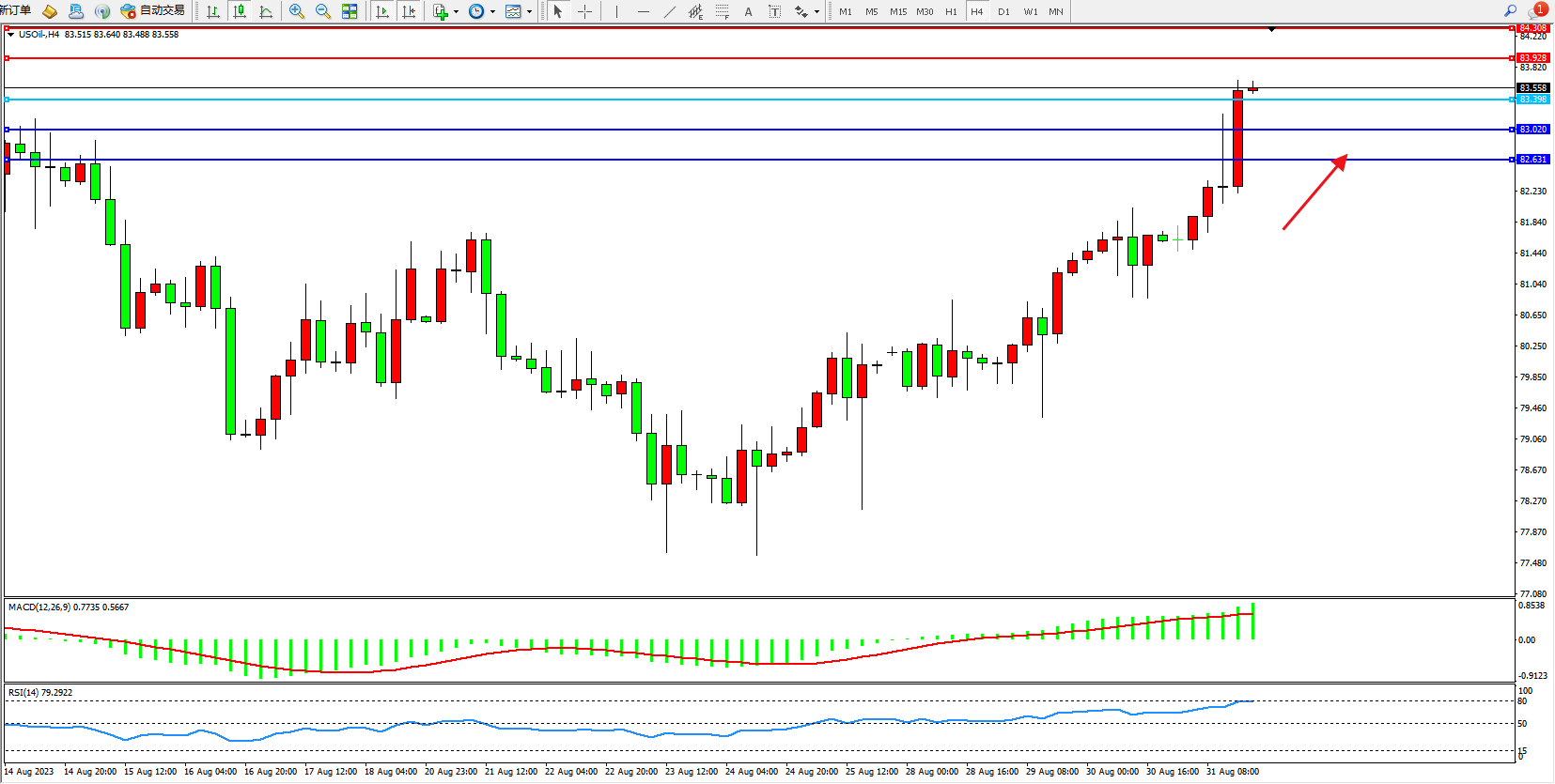 原油USOil——4小时K线图显示: